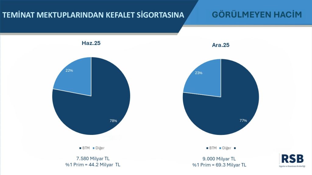 Söz konusu büyüklük, yalnızca bankacılık sektörü açısından değil; sigorta ve reasürans ekosistemi açısından da önemli bir potansiyeli işaret etmektedir. Zira bu hacimdeki gayrinakdi kredilerin kefalet senedi yapısıyla karşılanması halinde, sigorta sektörü açısından 69.3 Milyar TL seviyesinde bir prim üretim potansiyeli ortaya çıkmaktadır.